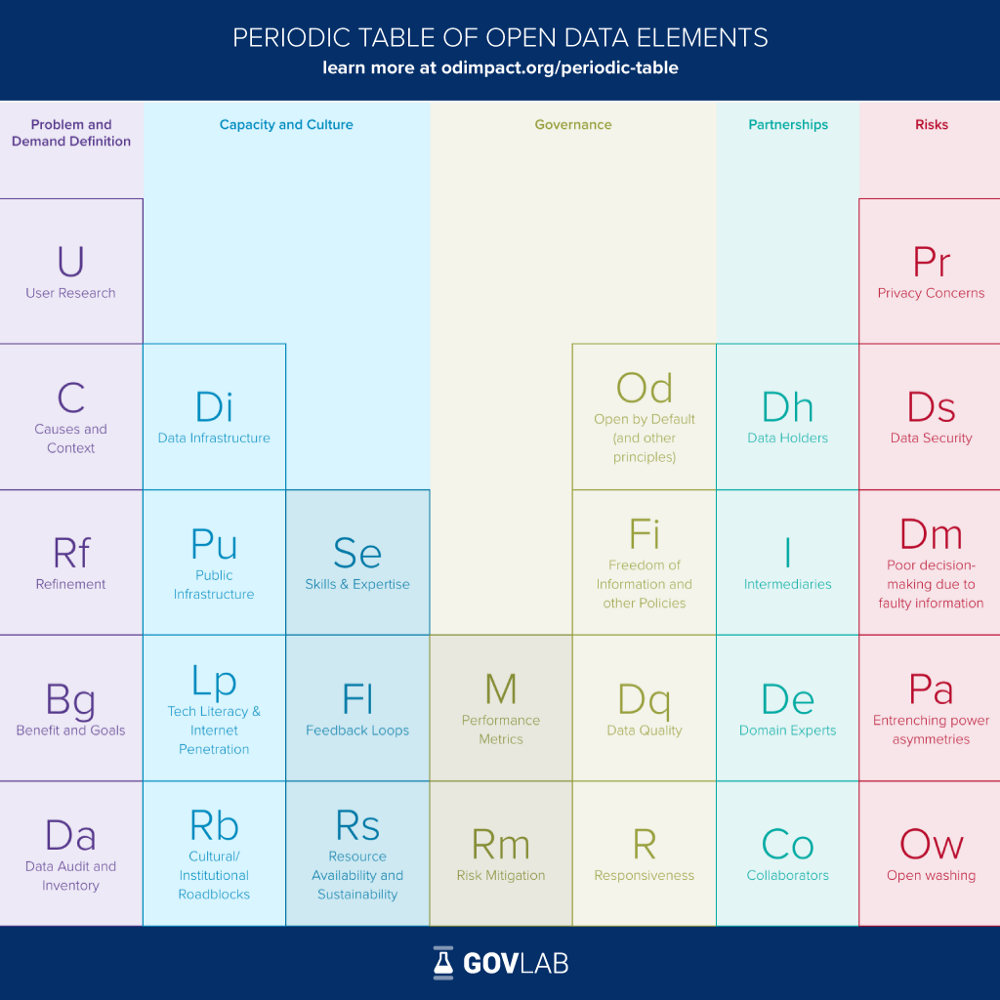 The work for this last component relied on an adapted version of The GovLab’s Periodic Table of Open Data. Developed as part of an in-depth exploration of open data’s global impact, The Periodic Table provides enablers, challenges, and risks related to uses of open government data.